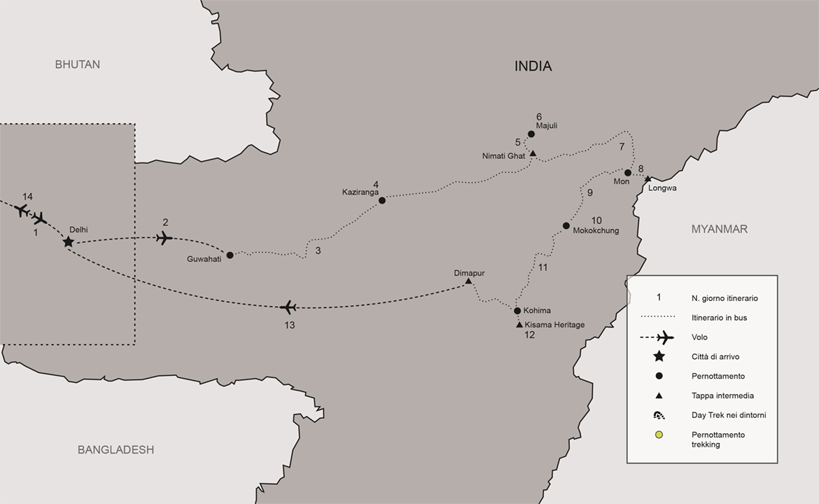 Nel cuore dell’India nord-orientale, dove le tradizioni ancestrali si mescolano con paesaggi incontaminati e luoghi intrisi di mistero, si staglia un viaggio destinato a risvegliare gli animi più ardimentosi e a incantare i cuori più curiosi. Ci avventureremo nell’Assam e nel Nagaland, per esplorare terre remote e immergerci nella cultura millenaria di queste affascinanti regioni. Il nostro itinerario inizia con l’energia frenetica di Delhi, punto di partenza di ogni grande avventura indiana. Da qui, ci dirigeremo verso Guwahati, città portuale affacciata sul fiume Brahmaputra, per poi proseguire verso il Parco Nazionale di Kaziranga, famoso per i suoi rinoceronti. Continueremo il nostro viaggio fino a Majuli, l’isola sacra del Brahmaputra, dove antiche tradizioni religiose e culturali ci aspettano. In seguito, raggiungeremo le terre del Nagaland, esplorando villaggi tradizionali come Mon e Longwa. Giungeremo, infine, a Kohima per prendere parte alle celebrazioni dell’Hornbill Festival, dove respireremo una vivace atmosfera di danze, canti e colori. In questo viaggio in India, più di un semplice itinerario turistico, scopriremo l’anima vibrante e affascinante del Nord-Est indiano, lasciandoci trasportare dalla sua magia senza tempo.