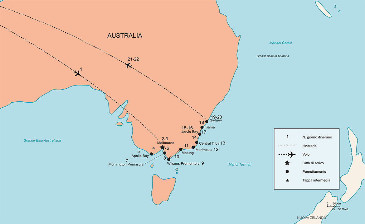 Australia on the road è un itinerario che, in tre settimane di pura libertà, vi porta alla scoperta del lato più iconico ed autentico della Terra dei Canguri. Da Melbourne, metropoli cosmopolita e creativa, parte un emozionante viaggio su misura tra panorami infiniti, fauna straordinaria e oceani scintillanti. Lungo la mitica Great Ocean Road, vi attendono scogliere a picco, foreste di eucalipti e i fotogenici Dodici Apostoli, mentre la Mornington Peninsula invita a esplorare spiagge dorate, cantine panoramiche e sorgenti termali. Nel selvaggio Wilsons Promontory National Park, potrete camminare tra canguri e wombat in una natura primordiale, prima di raggiungere la costa del Nuovo Galles del Sud e le acque turchesi di Jervis Bay, dove la sabbia è tra le più bianche al mondo. Concludete questo viaggio Australia on the road a Sydney, con il suo porto iconico, l’Opera House e i tramonti dorati su Bondi Beach: il perfetto finale per un itinerario tra città dinamiche, parchi incontaminati e libertà assoluta.