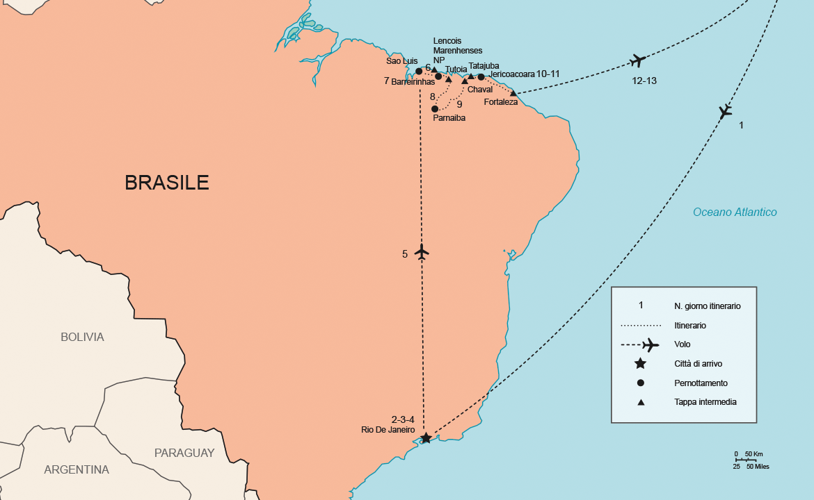 Questo itinerario vi regalerà un’esperienza off-road indimenticabile lungo uno dei tratti più suggestivi del litorale del Nord-Est brasiliano, percorrendo chilometri di spiagge paradisiache e deserte, popolate dai soli pescatori nativi. L’immensa distesa di dune dei parchi di Jericoacoara e del Lençois Maranhense, dove il bianco accecante della sabbia contrasta con l’azzurro intenso del cielo e delle lagune, vi farà compagnia dall’alba al tramonto. La magica Rio de Janerio vi regalerà una conclusione del viaggio a ritmo di samba.