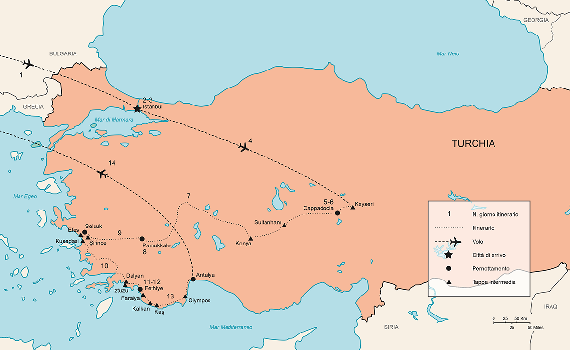 Completo viaggio in Turchia che vi permetterà di scoprire il meglio di questa terra a cavallo tra Europa ed Asia. Poche ore di volo ed è subito amore a prima vista: cupole e minareti, ponti ed arcate, pescatori e mercanti. Lei, l’antica capitale di tre imperi, si chiama Istanbul, siamo certi che vi lascerà senza fiato. Dallo stupore dell’antica Costantinopoli alla magia della Cappadocia: alternando formazioni laviche a città sotterranee, canyon a rupi stravaganti, vi sembrerà di fare una comparsa in una fiaba, ma quando osserverete il paesaggio dall’alto della mongolfiera realizzerete di esserne i protagonisti. Macinando chilometri, avrete l’opportunità di frammezzare località incredibili, come Pamukkale, piattaforme di calcite di un bianco accecante da cui sarà romantico osservare il tramonto, ed Efeso, il sito archeologico meglio conservato d’Europa, nonché elencato tra le sette meraviglie del mondo antico. La seconda parte di questo viaggio in Turchia on the road sarà dedicata al relax: seguendo la costa frastagliata del Mar Egeo, raggiungerete Fethiye, tra baie tranquille baciate da acque turchesi, per dedicarvi al dolce far nulla. La Turchia è un sorprendente mix di archeologia e natura, questo itinerario ne è la testimonianza.