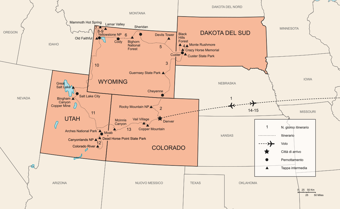 Un viaggio Yellowstone e vicini i parchi americani, perseguendo il mito degli indiani e del leggendario Cavallo Pazzo, vi permetterà di assaporare il cuore più profondo e l’anima più ancestrale degli Stati Uniti. Ribollenti geyser, bizzarre formazioni rocciose, fitte foreste, bisonti in amore. Protagonista indiscusso il più antico parco nazionale del mondo (fondazione datata 1872), lo Yellowstone. La più grande riserva naturale degli Stati Uniti, Patrimonio UNESCO dal 1978, è una gioia per gli occhi e per gli scatti fotografici. Questo itinerario usa on the road prosegue preservando forti emozioni: dai luoghi più curiosi e speciali del Colorado, come le Rocky Mountain e la piacevole Denver, una tra le città più vivibili d’America, agli incredibili parchi americani dello Utah, come l’Arches National Park e Canyonlands, paesaggi più unici che rari. Wyoming e South Dakota, seppur meno popolari, tengono alta l’asticella delle sorprese: oltre al Parco Nazionale di Yellowstone, immortalerete l’iconico Mt Rushmore, la vicina foresta di Black Hills e Devils Tower, la “torre del dio cattivo”, la rigogliosa area pubblica del Guernsey State Park, la Bighorn National Forest, un miscuglio di poderosi massi rocciosi, cascate, gole, canyon e sinuose strade panoramiche. Spazi infiniti, ritmo lento e scene d’altri tempi sono i punti fissi della vostra prossima avventura? Allora questo viaggio a Yellowstone e i parchi americani più sensazionali del nord degli States è l’itinerario on the road che fa per voi!